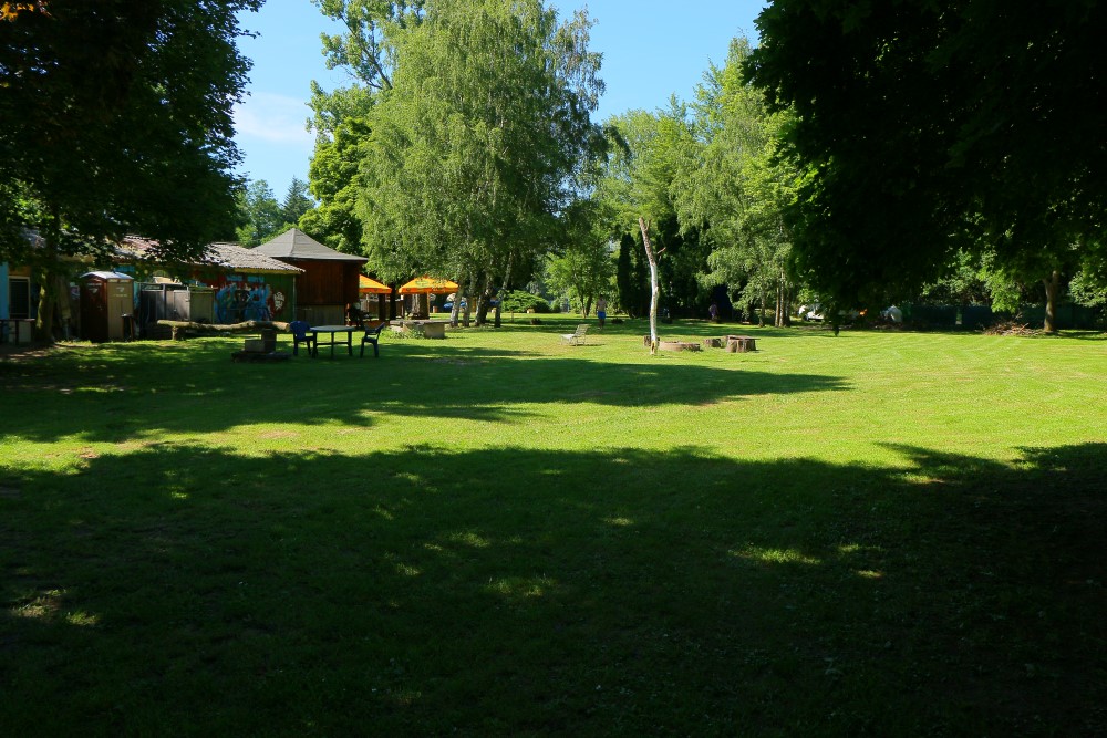 Na pláži jsou lavičky a travnatá část je částečně pokryta vzrostlými stromy.